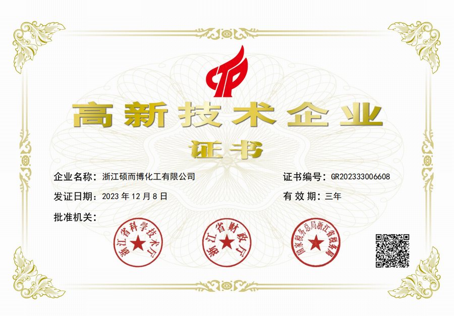 浙江碩而博化工有限公司創建于2007年,公司注冊資本4600萬元,總資產2億元,目前在崗員工120余人。公司廠區占地約40畝,位于浙江省衢州市智造新城產業園巨化廠二北路6號,物流大道南側,近鄰杭金衢高速、杭甬高速,交通十分便利。